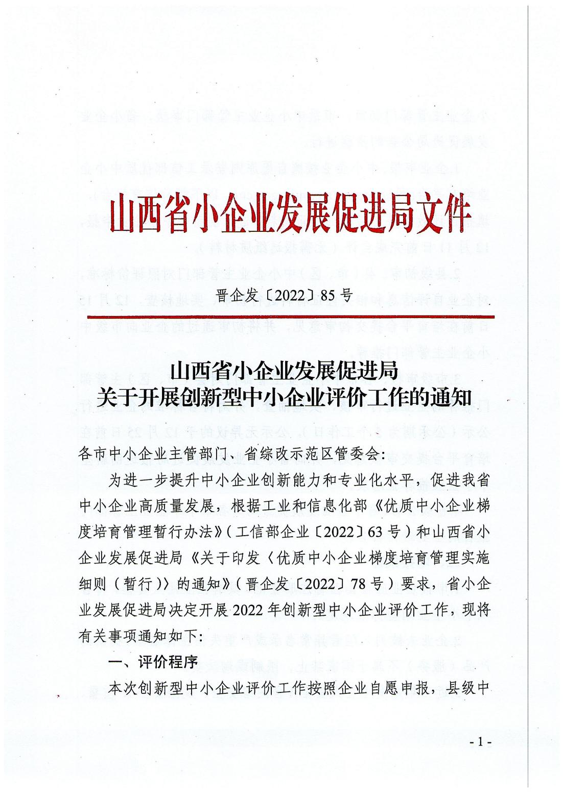 關(guān)于開展創(chuàng)新型中小企業(yè)評價(jià)工作的通知-晉企發(fā)【2022】85號